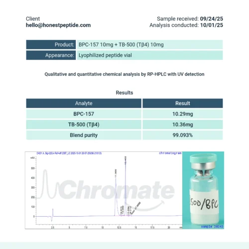 This blend combines BPC-157, a stable 15-amino-acid gastric peptide, with TB-500, the synthetic 7-amino-acid fragment (Ac-LKKTETQ-NH₂) of thymosin β4 that mediates actin-binding and cell-migration activity. In preclinical models, each peptide is studied for angiogenesis, cytoprotection, and tissue repair. When used together, the blend is investigated for its potential complementary effects, with BPC-157 supporting vascular integrity and nitric-oxide signaling while TB-500 enhances cell motility and actin dynamics.