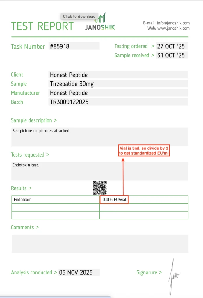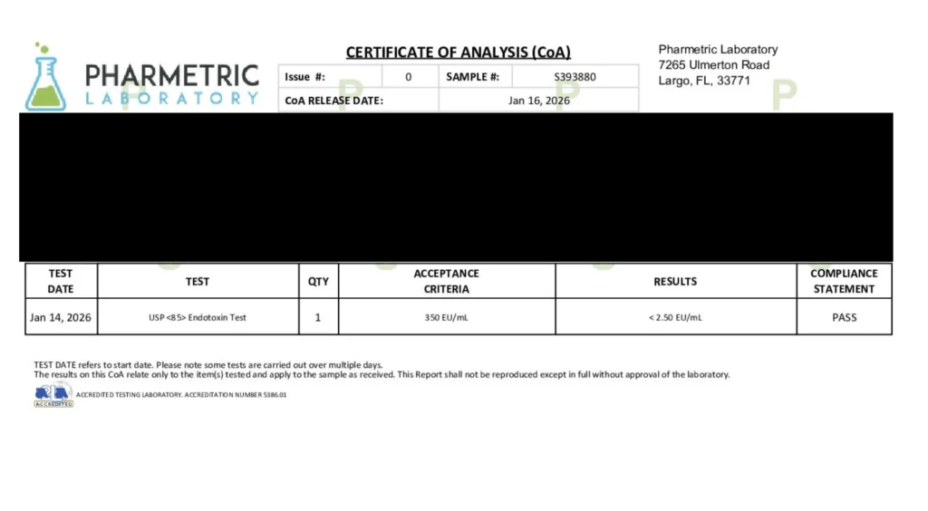 Note: Most 3rd Party providers group identity, purity and content into a single test result (e.g., Janoshik, annotated below). Contaminants usually require separate tests – typically 1 test for endotoxins and 1 for heavy metals.