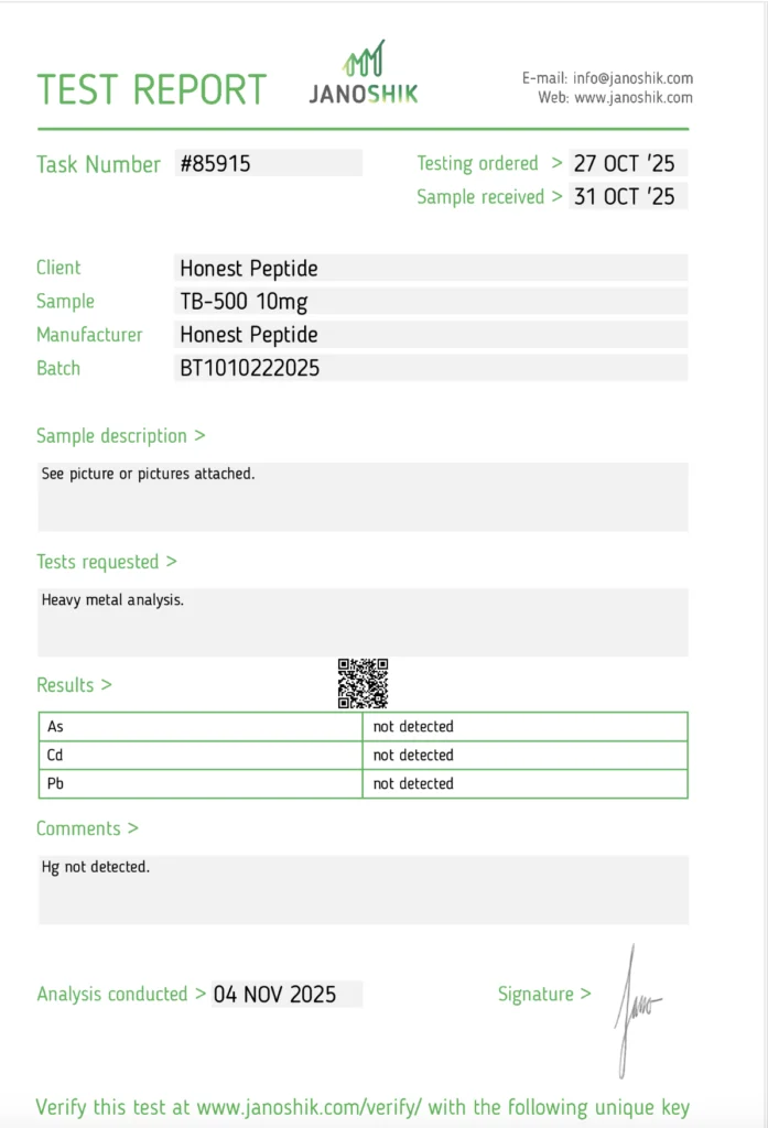 It is therefore crucial to test for heavy metals; accordingly, Honest Peptide tests for every single product for heavy metals.